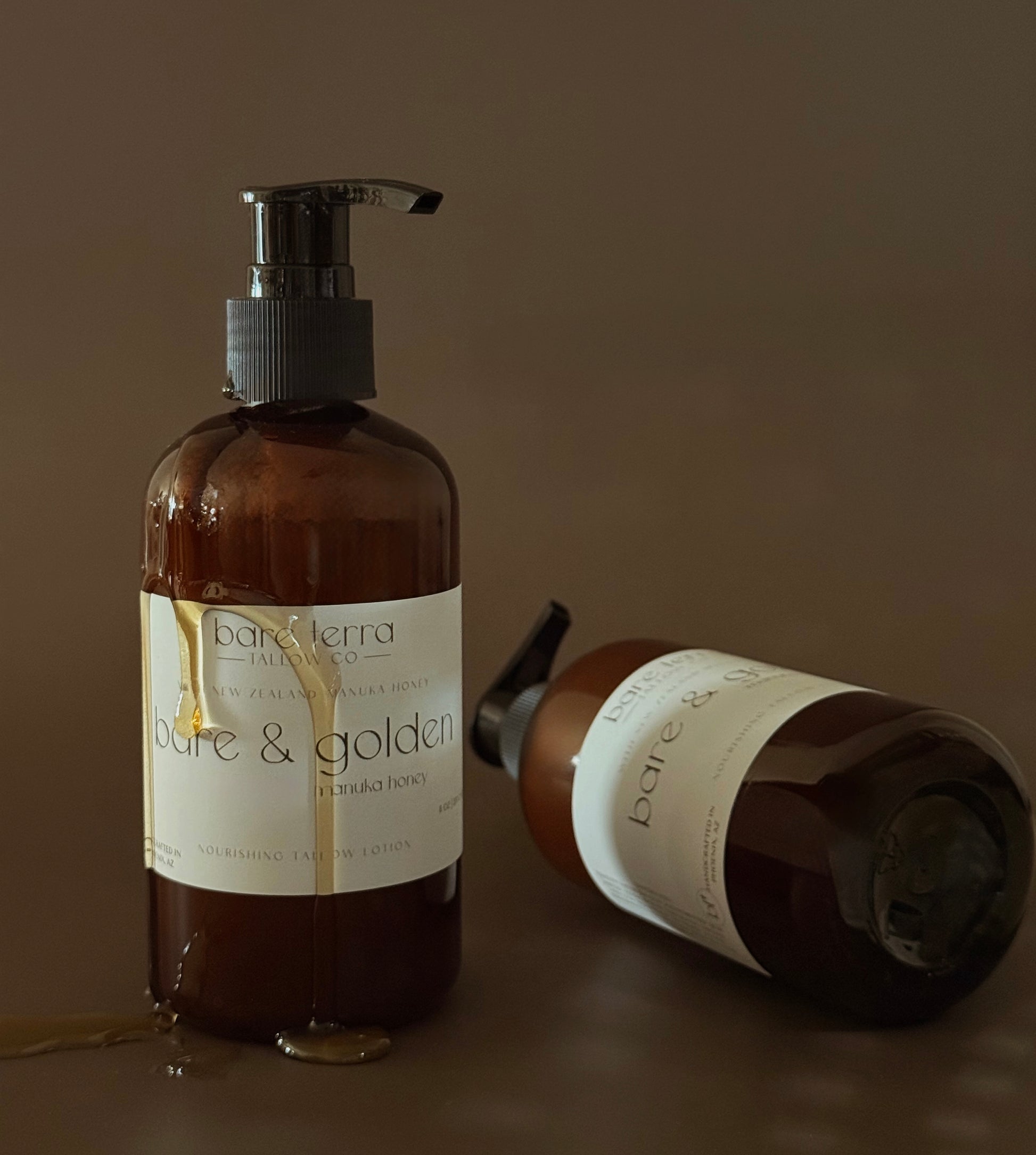 Indulge your skin in rich, natural nourishment with our Madagascar Vanilla infused tallow lotion, enhanced with the gentle sweetness of New Zealand Manuka honey. Carefully crafted, this formula blends the skin-loving benefits of tallow with honey in perfect harmony, preserving its potency while creating a luxuriously smooth texture. The result is a deeply moisturizing, soothing lotion that leaves skin soft, radiant, and subtly scented with warm, natural vanilla.