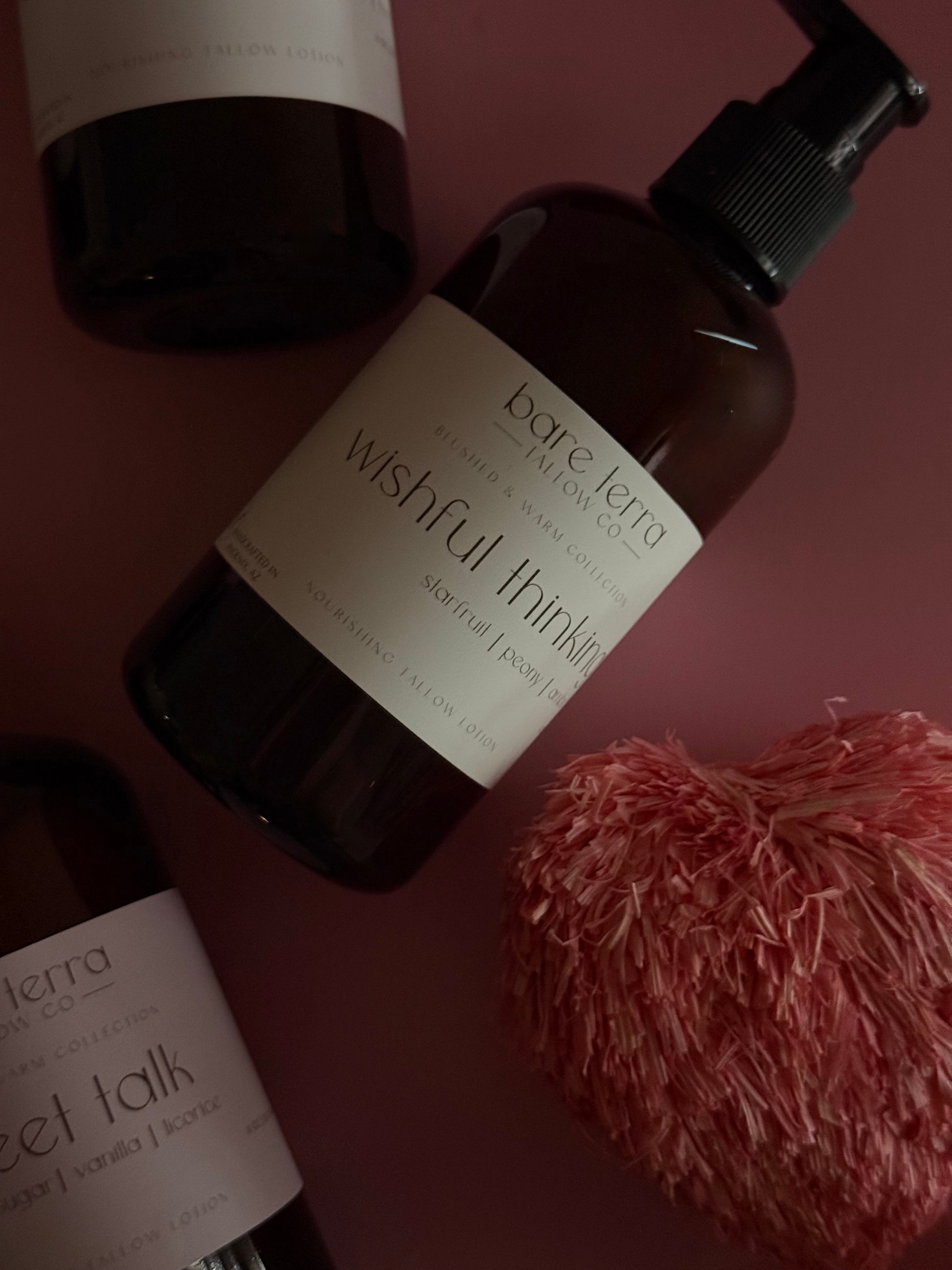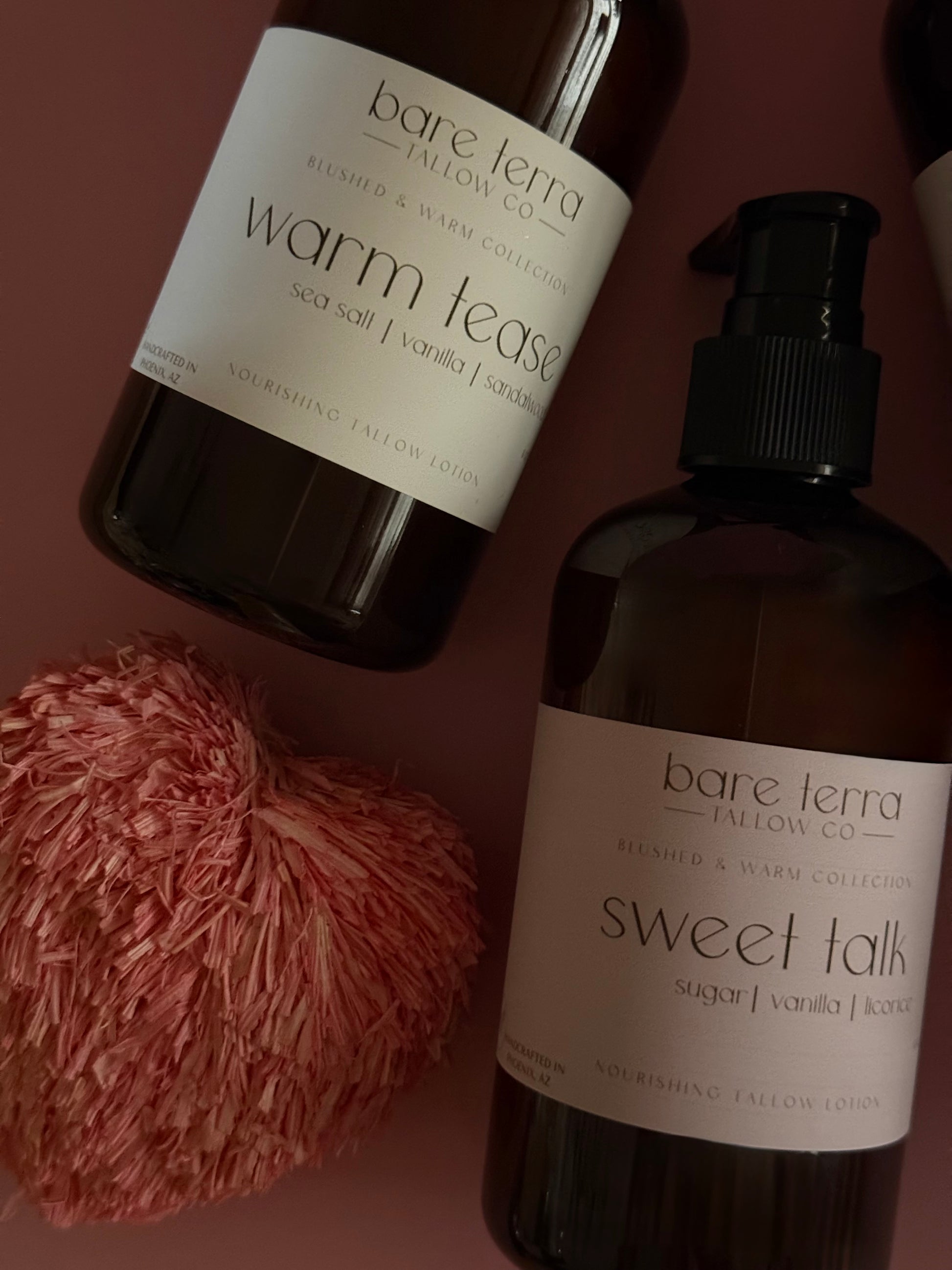 Made with our signature tallow base, each product deeply nourishes and helps protect dry, cold-weather skin. Blushed & Warm is comforting, a little flirty, and perfect for chilly days that still call for something sweet.